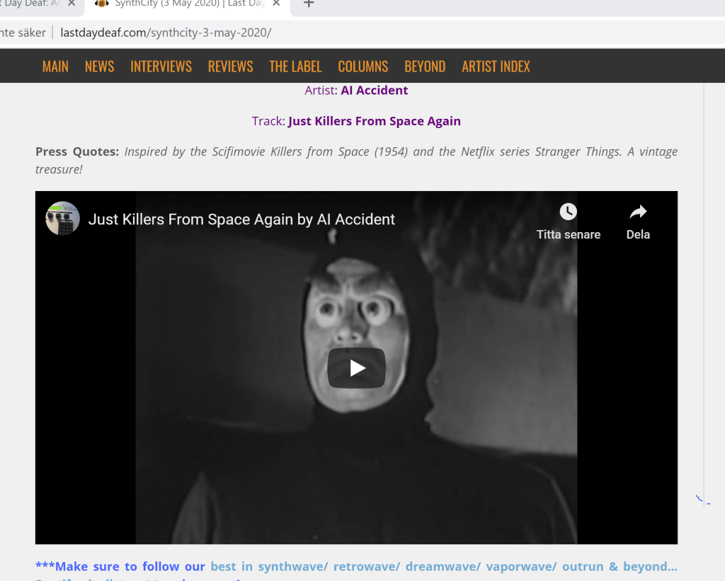 2020 Single Release, Just Killers From Space Again by Ai Accident with youtube music video